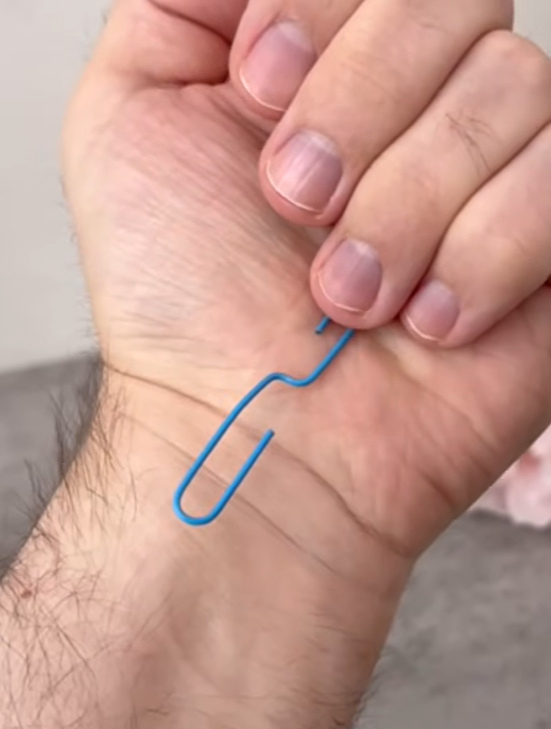 Het idee is kinderlijk simpel: buig een paperclip een tikkie open tot er een haakje ontstaat. Daarmee zet je het uiteinde van je armband tijdelijk vast terwijl je ’m om je pols legt.