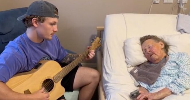 Op haar sterfbed had ze nog één heldere wens: haar achterkleinzoon nog een keer horen zingen. Ethan, die al zijn hele leven met muziek bezig is, twijfelde geen moment. Met zijn gitaar liep hij haar kamer binnen, ging naast haar zitten en liet de eerste rustige akkoorden horen. Dat intieme, tedere moment werd gefilmd, zodat de familie – en later ook de rest van de wereld – het kon meebeleven.