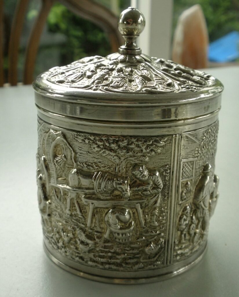 In veel huizen had je vroeger zo’n sierlijke metalen bus op tafel of in de keukenkast. Dat was de bekende theebus, een item dat niet alleen handig was, maar er ook mooi uitzag. Vooral de exemplaren die voor Douwe Egberts zijn gemaakt, kennen veel mensen nog. Ze kwamen uit de Nederlandse zilverfabriek Herman Hooijkaas en waren jarenlang een vertrouwd gezicht in de keuken.
