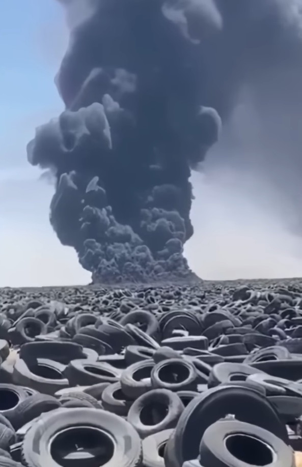 Vlak bij Al Jahra, aan de rand van de woestijn, ligt een van de grootste bandenbegraafplaatsen ter wereld. De beelden zijn surrealistisch: eindeloze rijen rubber met daarboven een dikke, verstikkende rookpluim die hoog de lucht in trekt. Het voelt alsof de aarde zelf brandt. En het is geen eenmalig vuurtje, maar een terugkerend tafereel op industriële schaal.