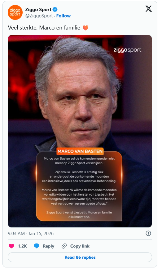 In een verklaring laat Ziggo Sport weten dat Van Basten voorlopig niet meer aanschuift in zijn vaste programma’s en ook geen wedstrijden zal analyseren. Het gaat om een persoonlijke en ingrijpende situatie: Liesbeth begint aan een intensief behandeltraject dat de komende maanden veel van haar en het gezin vraagt.