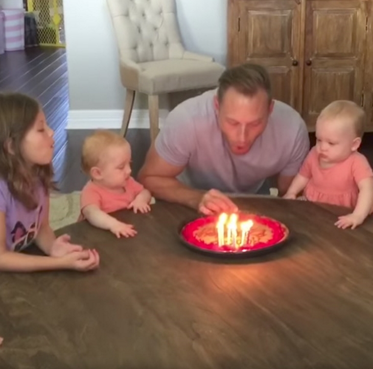 De oudste snapt direct wat er gaat gebeuren en zingt enthousiast mee met mama. De jongere meiden wachten gespannen af. Zodra het bekende “Happy Birthday” is gezongen, buigt papa zich voorover om de kaarsjes uit te blazen, niet beseffend dat er een lachsalvo op til is.