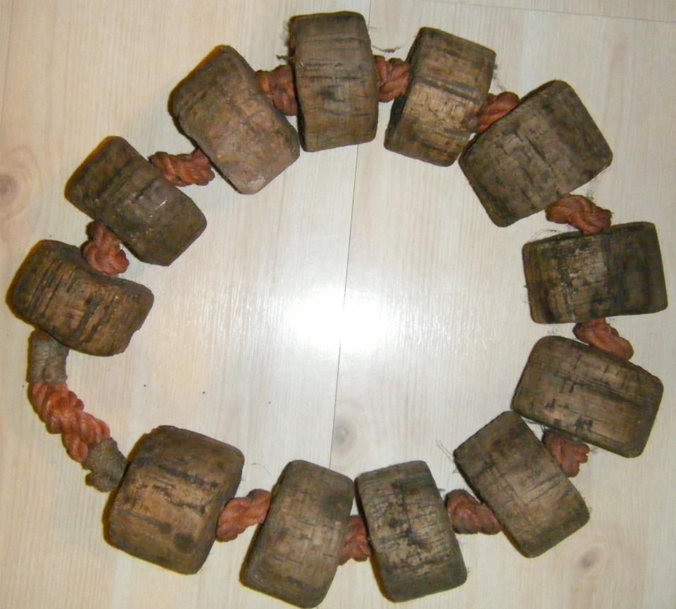 Op de foto zie je een koordje of bandje met een rits ovale, bruine blokjes — ze doen denken aan kurken van wijnflessen. Het oogt heel basic, bijna primitief. Is het een versiersel? Een zelfgemaakt sieraad? Of toch iets uit het keukenkastje?
