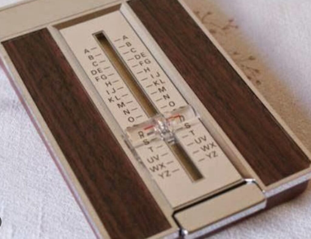 Zo’n klapper stond vaak naast de vaste telefoon. Je stelde ’m in op een letter van het alfabet en met een druk of draai sprong hij open op de bladzijde waar alle namen en nummers onder die letter stonden. Daarmee vond je een contact sneller dan wanneer je een gewoon papieren adresboek doorbladerde.