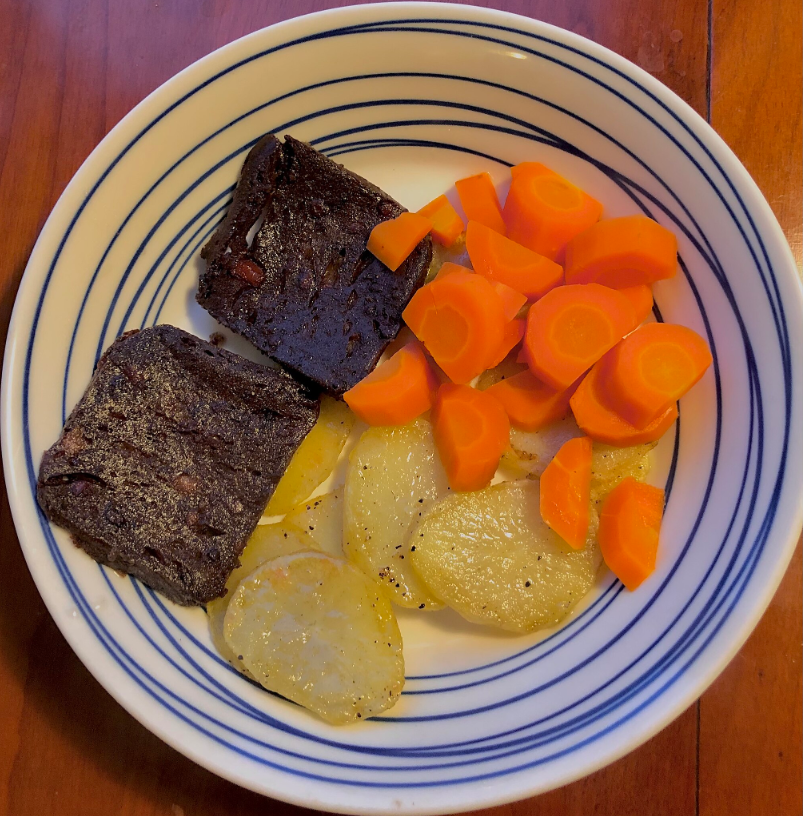 Op het bord zie je een portie van een gerecht waar de één blij van wordt en de ander juist van griezelt: balkenbrij. Een oer-Hollandse klassieker, vaak geserveerd met gebakken aardappels en wat groente erbij, zoals hier met worteltjes.