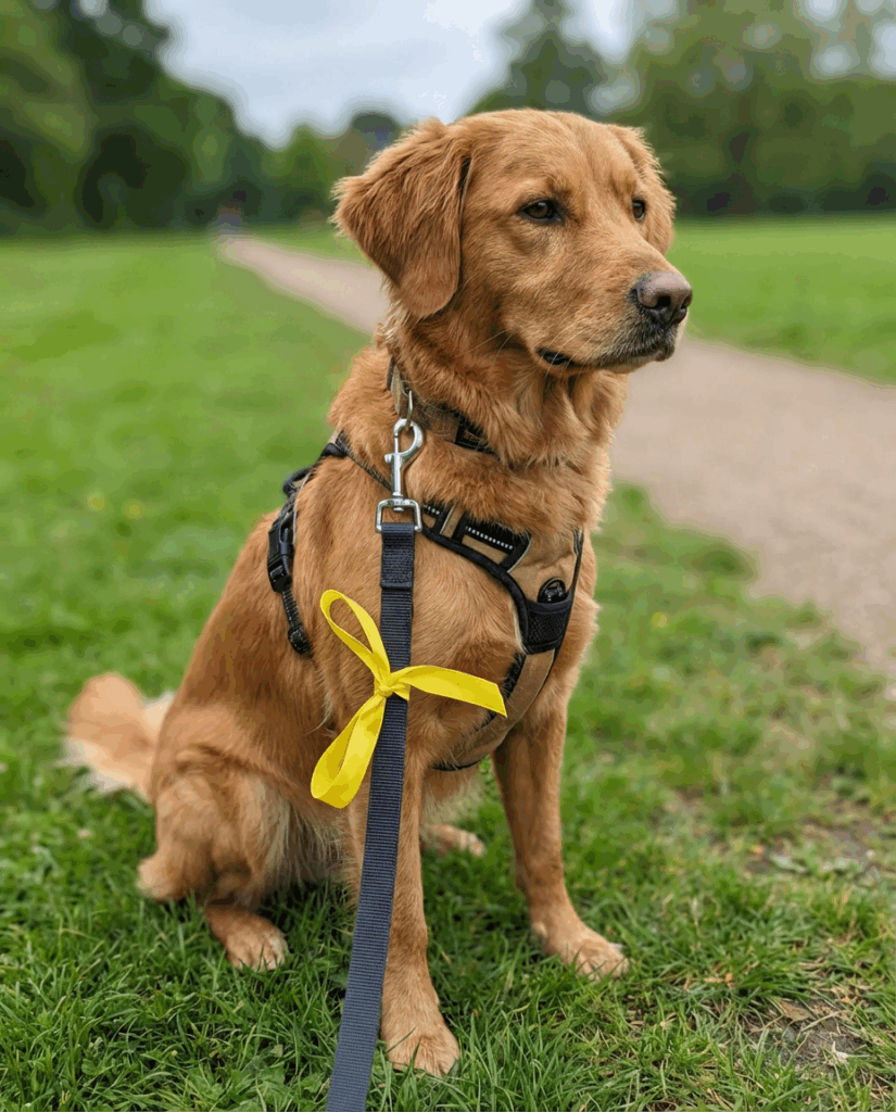 Honden die in training zijn hebben baat bij minder prikkels. Onverwacht contact stoort de oefening. Met een gele strik laat je weten dat je hond aan het werk is en focus nodig heeft.